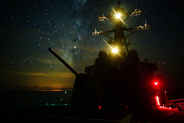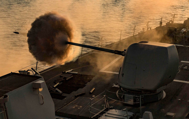 Tàu khu trục mang tên lửa dẫn đường lớp Arleigh Burke USS Carney phóng hỏa lực trong cuộc tập trận bắn đạn thật hồi tháng 9.
