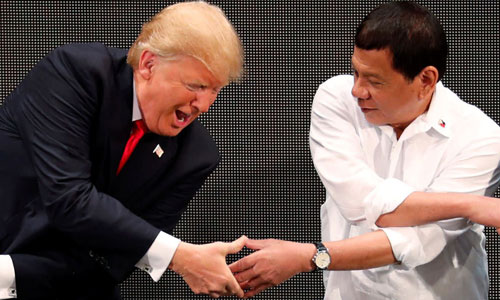 Tổng thống Mỹ Donald Trump (trái) bắt tay người đồng cấp Philippines Rodrigo Duterte trong một sự kiện năm 2017. Ảnh: Reuters.