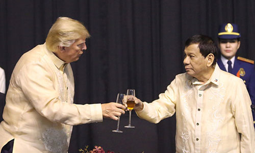 Duterte (phải) cụng ly với Trump trong sự kiện kỷ niệm 50 năm ngày thành lập ASEAN ở Manila. Ảnh: AFP.