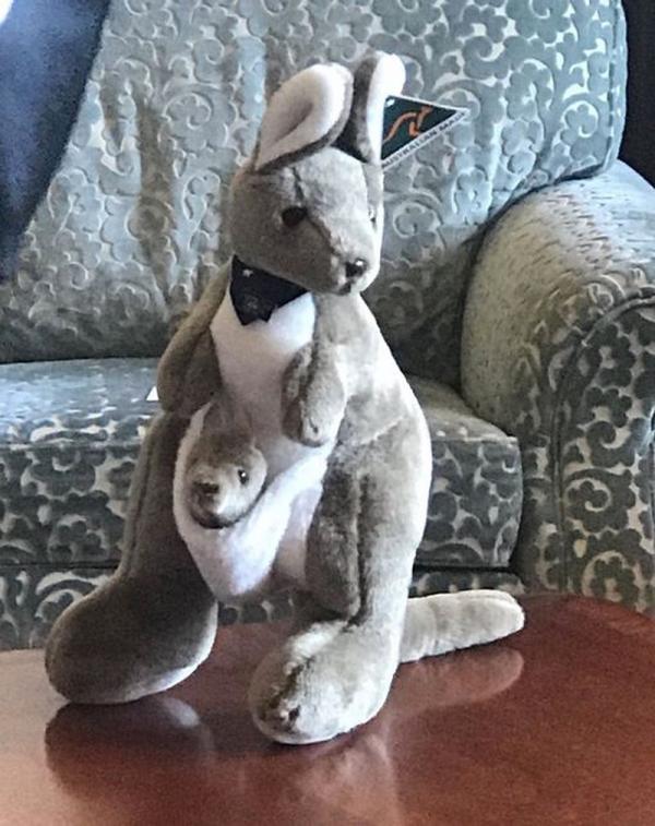 “Thật là đáng yêu, đây là món quà đầu tiên của em bé chúng tôi"- nữ công tước xứ Sussex vừa nói vừa khoe chú kangaroo nhồi bông đáng yêu, kèm với một chú kangaroo con ngồi trong bụng mẹ.
