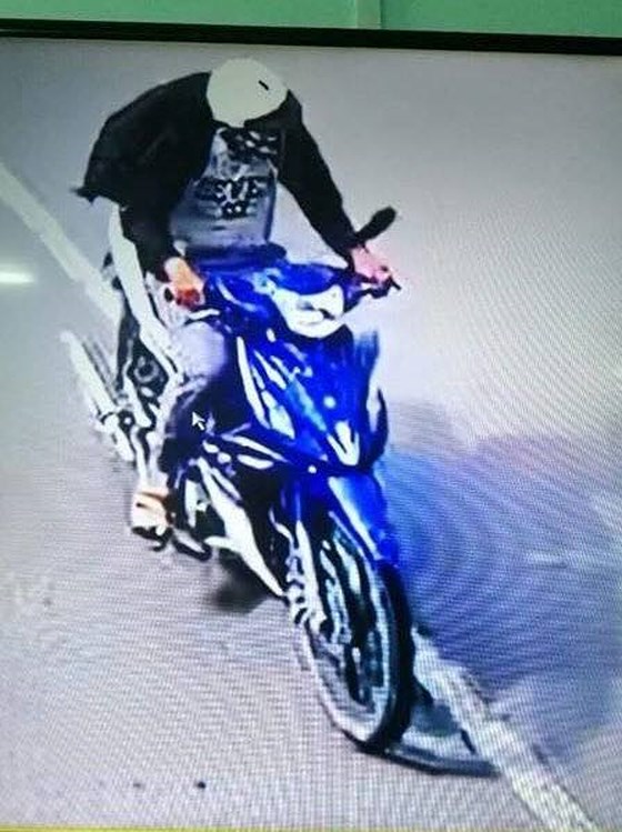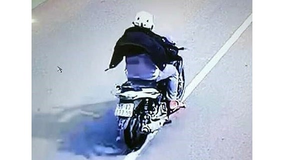 Theo hình ảnh từ camera, đối tượng này mặc áo thun, quần jeans, áo khoác đen, mũ bảo hiểm màu trắng, đeo khẩu trang, đi xe hiệu Suzuki Axelo mang BKS: 55K2-137.59 và tay của thanh niên này vẫn còn dính máu.