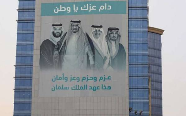 Hình ảnh các thành viên quyền lực của Hoàng gia Saudi Arabia trên 1 tòa nhà thương mại ở nước này. (Ảnh: Bloomberg)