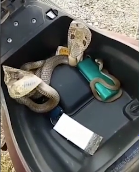 Bạn có thể tượng tượng cảnh này khi mở cốp xe máy. Đó là những con rắn hổ mang còn sống và rất hung hăng trong cốp xe. Nhất định ai cũng hoảng hồn vì loài rắn độc này.
