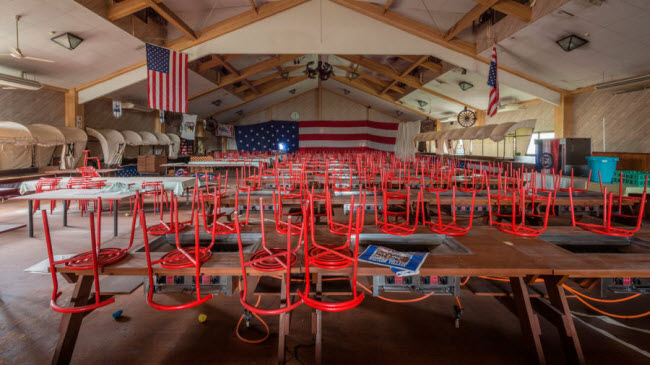 Những chiếc ghế trông vẫn còn mới trong một hội trường được trang trí theo phong cách Mỹ.