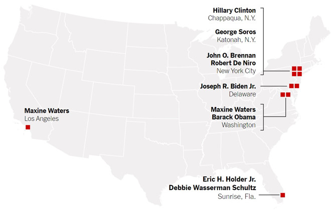 10 thiết bị nổ đã được tìm thấy kể từ ngày 22/10, tất cả cá nhân được nhắm tới đều là người thuộc phe Dân chủ hoặc những cá nhân thường xuyên chỉ trích Tổng thống Donald Trump. Đồ họa: New York Times.