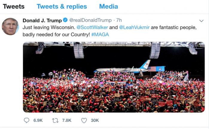 Tổng thống Trump đã tới Wisconsin cho một buổi vận động ủng hộ ứng viên đảng Cộng hoà Leah Vukmir và Scott Walker. (Ảnh: Twitter/ Donald J.Trump)