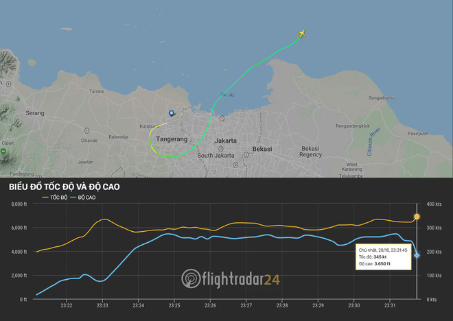 Chỉ 13 phút kể từ khi chiếc máy bay chở 189 người cất cánh rồi lao xuống biển quả thực là 1 tai nạn khiến ai cũng phải bất ngờ. Tuy nhiên mọi việc bất thường dường như chỉ xảy ra ở 2 phút cuối của chiếc máy bay này. Hiện mọi công tác cứu hộ vẫn đang được khẩn trương thực hiện. Theo Flightradar24, dữ liệu cuối cùng ghi nhận lúc 6h31 (2 phút trước khi JT-610 biến mất khỏi radar) cho thấy máy bay giảm độ cao đột ngột.