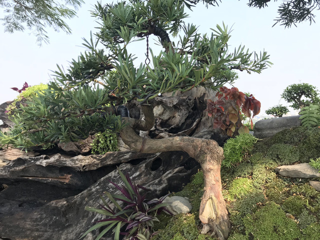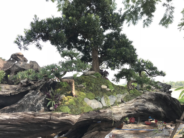 7 cây vạn niên tùng được dựng trên 1 khúc thân cây