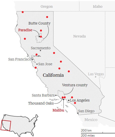 Báo Guardian dẫn lời các quan chức Mỹ thống kê, số nạn nhân tử vong vì các đám cháy rừng lan rộng ở California hiện đã lên tới 25 người. Trong đó, thêm 14 thi thể được phát hiện tại thị trấn Paradise và khu vực lân cận ở miền bắc California, nâng tổng số người thiệt mạng tại đây lên con số 23. Hai trường hợp thiệt mạng khác được ghi nhận ở khu vực phía nam của bang, gần Malibu.