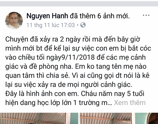 Đến tối 11/11, tài khoản Facebook này tiếp tục kể lại câu chuyện “Con em bị bắt cóc vào chiều tối ngày 9/11/2018” kèm theo h́nh ảnh một bé trai.