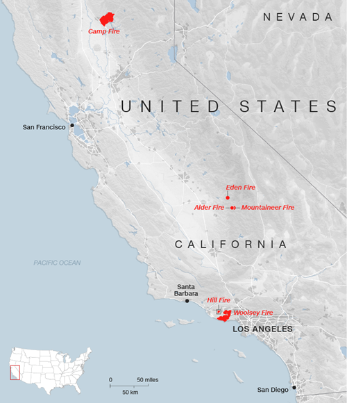 Ngoài đám cháy rừng Camp, lực lượng cứu hỏa California c̣n đang phải cùng lúc đối phó với hai đám cháy khác là Woolsey và Hill.