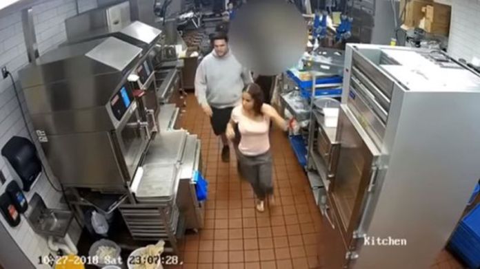 Cô nắm tóc, nắm cổ nữ nhân viên, đập cô vào máy nước ngọt làm đổ nước ngọt và nhiều ly rớt xuống sàn. Trong khi đó, một khách hàng khác đang ngồi trong xe đợi lấy thức ăn không biết làm gì nên chỉ nhìn thôi.