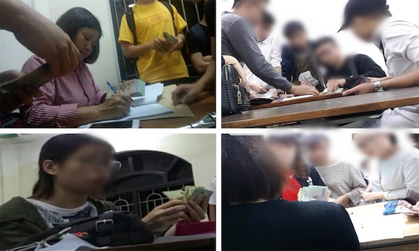 Trái ngược lại, tại buổi sáng cùng ngày, khoảng 300 sinh viên đã đóng tiền “chống trượt” sắc mặt tự tin. Một sinh viên nữ cho biết: “Không đóng tiền thì auto (tự động) trượt”. Còn một sinh viên nam trông khắc khổ, tâm sự: “Thi kiểu không đóng tiền mãi không qua nên phải đóng tiền thi cho qua. Bằng này chỉ là bằng nội bộ ở trường, không có giá trị khi ra bên ngoài”.