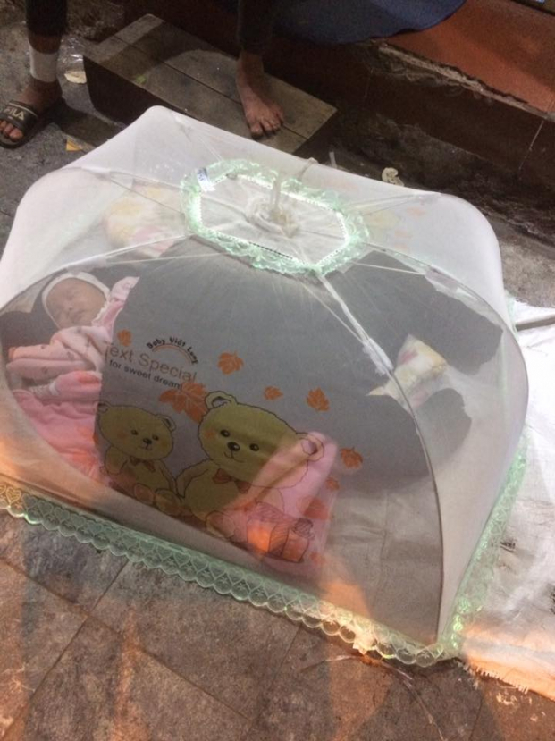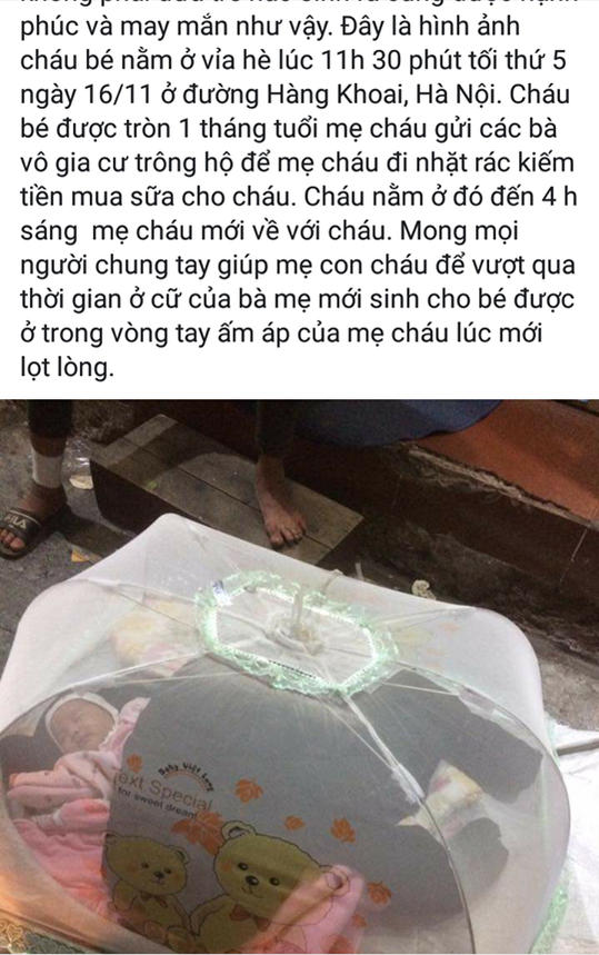 Người đăng tải thông tin cho biết, cứ đến đêm, mẹ cháu bé lại cho cháu nằm ngủ trên vỉa hè, chụp màn lên và gửi những người vô gia cư trông hộ để đi nhặt rác kiếm tiền mua sữa.