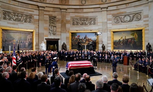Gia đình Bush do con trai cả kiêm cựu tổng thống George W. Bush dẫn đầu đi cùng linh cữu trên chiếc Không Lực Một. Lãnh đạo phe đa số tại Thượng viện Mitch McConnell, quan chức đầu tiên phát biểu ở mái vòm, mô tả cố tổng thống Bush là một "người phụng sự khiêm tốn" và "lãnh đạo nguyên tắc".