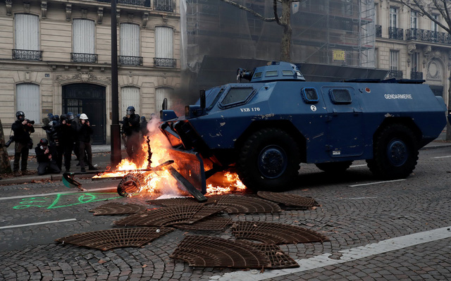 Xe bọc thép của Hiến binh Pháp trên Đại lộ Champs-Elysées ở thủ đô Paris ngày 8-12 - Ảnh: REUTERS