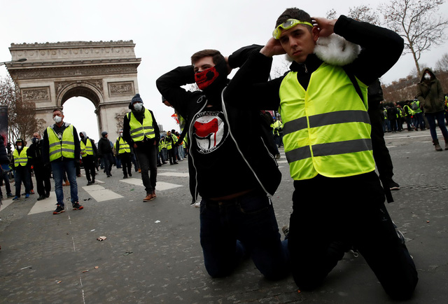 Người biểu tình quỳ gối và giả tư thế bị bắt giữ tại Quảng trường Ngôi sao gần Khải Hoàn Môn trên Đại lộ Champs-Elysées ở thủ đô Paris ngày 8-12 - Ảnh: REUTERS
