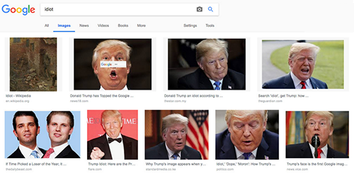 Google bị chất vấn vì ảnh Trump xuất hiện khi gõ 'gã ngốc'. Kết quả tìm kiếm hình ảnh trên Google với từ khóa "idiot". Trong phiên điều trần với Ủy ban Tư pháp Hạ viện Mỹ, CEO Google được đặt nhiều câu hỏi liên quan đến cách công cụ tìm kiếm hoạt động
