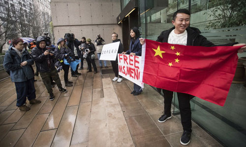 Hoa kiều tập trung đòi thả tự do cho bà Mạnh bên ngoài tòa án ở Vancouver hôm 7/12. Ảnh: Canadian Press.