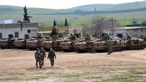 Xe thiết giáp của quân đội Thổ Nhĩ Kỳ tập trung tại căn cứ quân sự trong lãnh thổ Syria sát biên giới với Thổ Nhĩ Kỳ