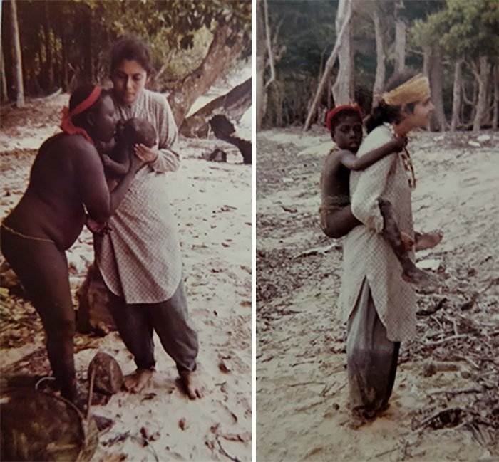 Madhumala bế một em bé của bộ tộc Jarawa