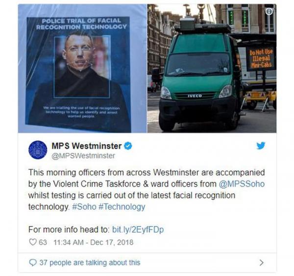Thông báo về việc thử nghiệm công nghệ quét mặt, nhận diện khuôn mặt ở một số nơi tại London trên Twitter - Ảnh: Twitter