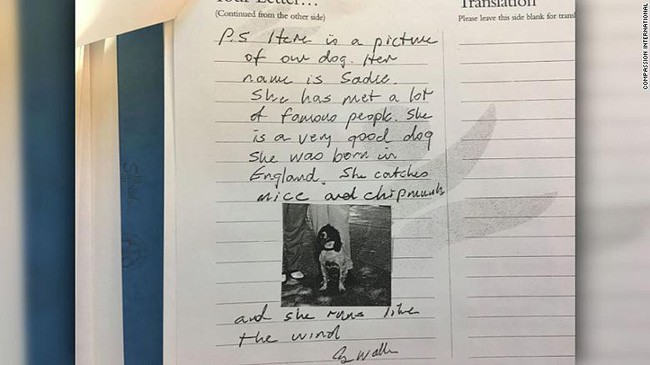 Đây là ảnh Sadie - cô cún của hai bác. Nó đã gặp rất nhiều người nổi tiếng rồi đó. Sadie là một con chó tốt đến từ nước Anh. Nó có thể bắt chuột, sóc đất và chạy nhanh như gió. Ký tên: G. Walker
