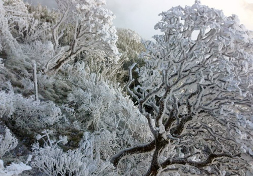 Băng tuyết phủ trắng cây cối ở khu vực rừng Hoàng Liên (Sa Pa) cuối năm 2017. Ảnh: Chiến Nguyễn.