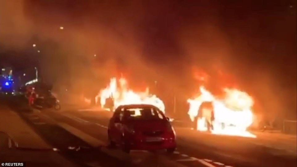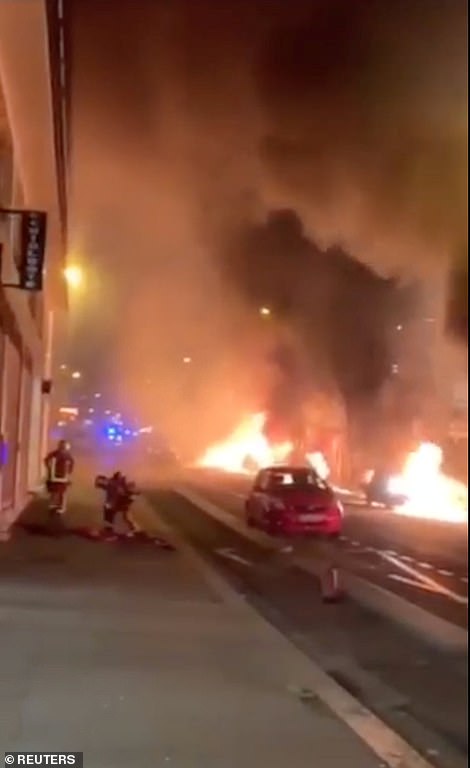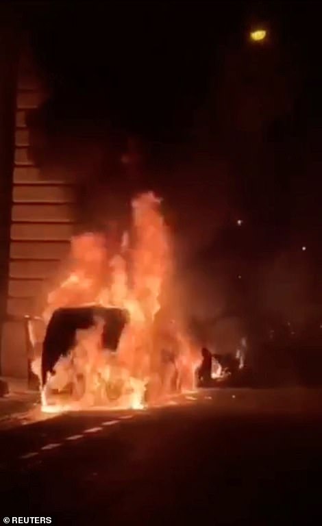 Ô tô bị đốt cháy trên đường Paris. Ảnh: Reuters