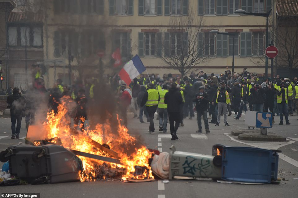 Mặc những ngày ngày Tết, biểu tình của phe "áo vàng" vẫn xảy ra tại Paris. Những người biểu tình đốt phá thâu đêm. Ngay cả tháp Eiffel cũng chòm trong khói đen.