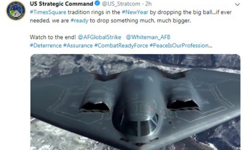 Bộ chỉ huy chiến lược Mỹ (USSTRATCOM), cơ quan giám sát kho vũ khí hạt nhân của Mỹ, đã phải xin lỗi vì thông điệp thả bom trong lễ mừng năm mới đăng trên mạng xã hội Twitter chỉ nói đùa, khiến Mỹ phải hứng chỉ trích dữ dội từ dư luận.