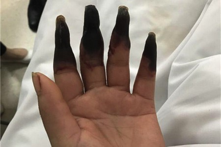 Cuối cùng, các ngón tay cô Zhang cũng biến thành một màu đen xì như than cháy. Không chỉ ở quanh vết thương mà cả tay trái rồi tay phải, cả 8 ngón tay trên hai bàn tay đều đổi màu, chỉ ngoại trừ có ngón cái của bàn tay trái và ngón áp út của bàn tay phải.Đến lúc này, cô Zhang mới vội vàng tới bệnh viện khám xét. Tuy nhiên, chứng hoại tử đã khiến hai tay của người phụ nữ 53 tuổi bị ngứa, khô, đau và cuối cùng là dần dần tê liệt.