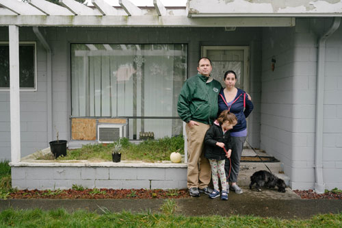 Joseph Gudge (trái) đứng cùng vợ con bên ngoài căn nhà đi thuê ở bang Washington. Ảnh: NYTimes.