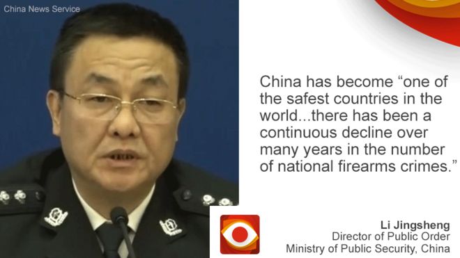 Nói về tội phạm có sử dụng súng th́ Trung Quốc có thể là một trong các nước có tỷ lệ thấp nhất, bởi chính phủ có những hạn chế rất nghiêm ngặt đối với súng. Tuy nhiên có những lời dối trá, những lời dối trá trắng trợn, và những số liệu thống kê về t́nh trạng phạm tội ở Trung Quốc, sau khi quan chức công an Trung Quốc Lư Kinh Sinh nói rằng nước này là "một trong các quốc gia an toàn nhất thế giới".