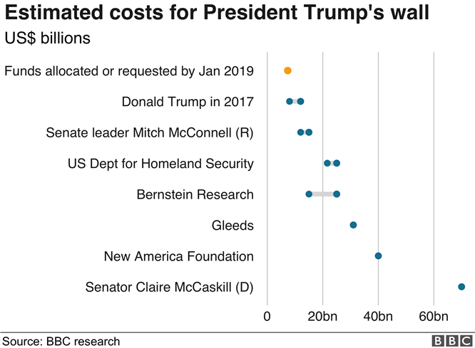 Dù rằng lúc tranh cử, ông Trump nói ông sẽ bắt Mexico phải trả tiền xây tường.Tuy nhiên, nhiều mức ước tính khác nhau đã được đưa ra bởi các cơ quan chính thức và không chính thức - dao động từ 12 tỷ đến 70 tỷ đô la.