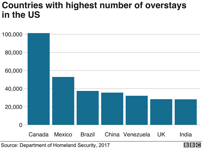 Người Canada là nhóm ở quá hạn cao nhất, theo số liệu của DHS, tiếp đến là người Mexico và người Brazil.