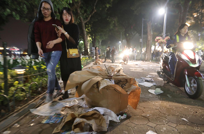 Rác ngập khu vực Hồ Gươm sau giao thừa. Người dân vẫn xả rác xuống đường mặc dù có nhiều thùng rác. Sau đêm giao thừa, đường phố Hà Nội sạch đẹp thường ngày đã như một "bãi rác" lộ thiên.