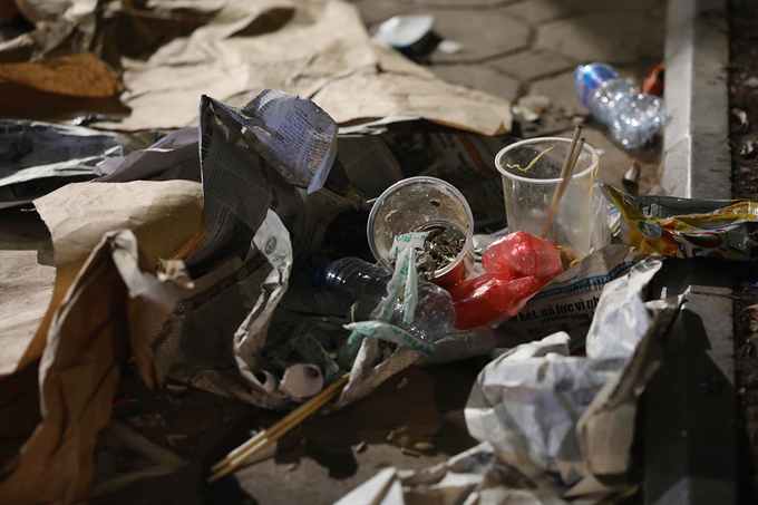 Nhiều đống rác chất cao quá đầu người. 1h30 công nhân môi trường bắt đầu quét dọn khi người dân đã di chuyển khỏi khu vực hồ Hoàn Kiếm.