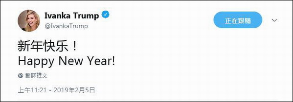 Ivanka đã viết trên Twitter bằng cả tiếng Trung và tiếng Anh: Chúc mừng năm mới! Chúc mừng năm mới!!