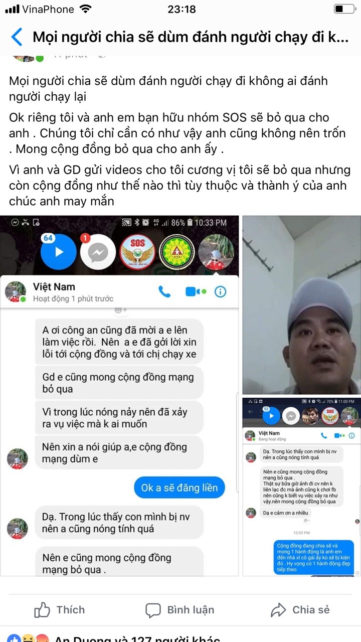 "Chính vì quá bất bình nên anh em chúng tôi tìm gặp tài xế T để hỏi rõ tại sao lại có hành động như vậy và đề nghị xin lỗi công khai. Giờ T đã gửi clip đến chúng tôi để chuyển lời xin lỗi đến mọi người thì cũng mong cộng đồng tha thứ. Đánh người chạy đi chứ không ai đánh người chạy lại." - anh Trường nói.