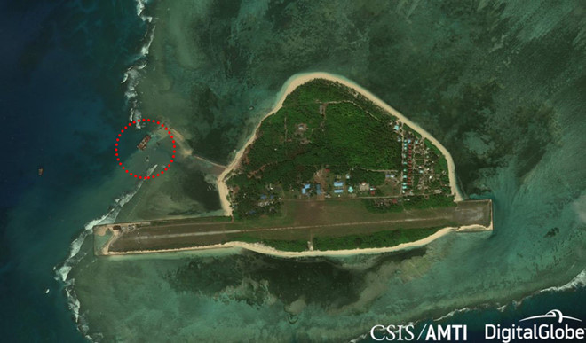 Ảnh vệ tinh ngày 14/12 cho thấy một chiếc sà lan của Philippines neo đậu ở bờ tây của đảo Thị Tứ phục vụ việc xây dựng. Ảnh: CSIS/AMTI.
