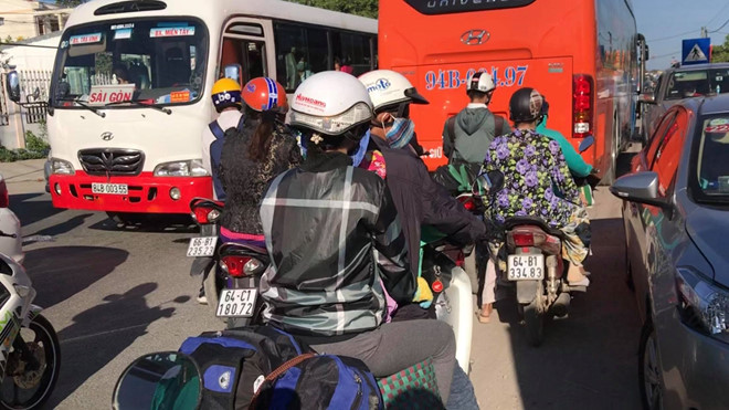Tuy nhiên, thực tế rất khác so với những năm trước, tình trạng ùn tắc giao thông năm nay xảy ra rất nghiêm trọng. Vừa qua cầu Cần Thơ, lượng xe đã bắt đầu ùn ứ và kéo dài hàng chục km. Những chiếc xe máy chở hai, đèo thêm đồ đạc lỉnh kỉnh; nhiều gia đình hai vợ chồng chở theo 2 con nhỏ trên xe máy lũ lượt nhích đi từng chút trong cái nắng gay gắt. Hai làn xe ô tô cũng ken kín phương tiện, giành nhau từng mét đường.