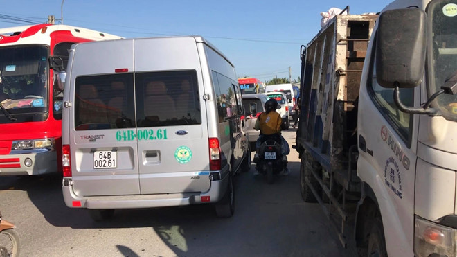 Đến đoạn Khu công nghiệp Hòa Phú, cách đường tránh TP.Vĩnh Long lên cầu Mỹ Thuận khoảng 4 km, tuyến QL 1 gần như tê liệt.