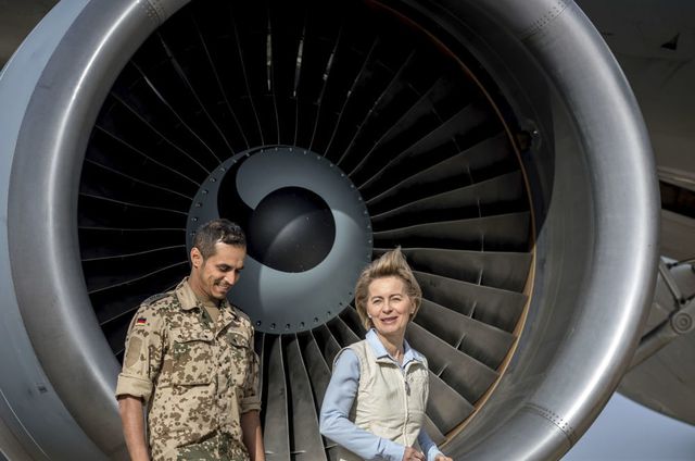 Bộ trưởng Quốc phòng Đức Ursula von der Leyen (phải) cùng một một binh sĩ Đức trong chuyến thăm thăn cứ không quân Azraq tại phía bắc Jordan tháng 1/2018.