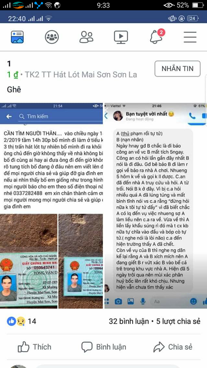 Thông tin tìm người nhà mất tích của gia đình nạn nhân Tòng Văn Dân được đăng trên mạng xã hội.