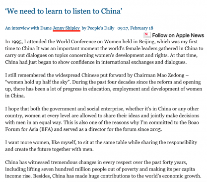 Trang web tiếng Anh của tờ Nhân dân Nhật báo (China Daily) ngày 18/2 đã xuất bản một bài báo về cựu Thủ tướng Jenny Shipley của New Zealand với tiêu đề “Chúng ta cần học cách lắng nghe Trung Quốc” (We need to learn to listen to China).
