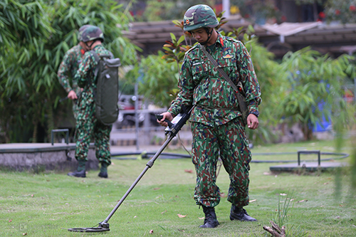 Công binh rà mìn trong khuôn viên khách sạn. Ảnh: Phạm Dự.
