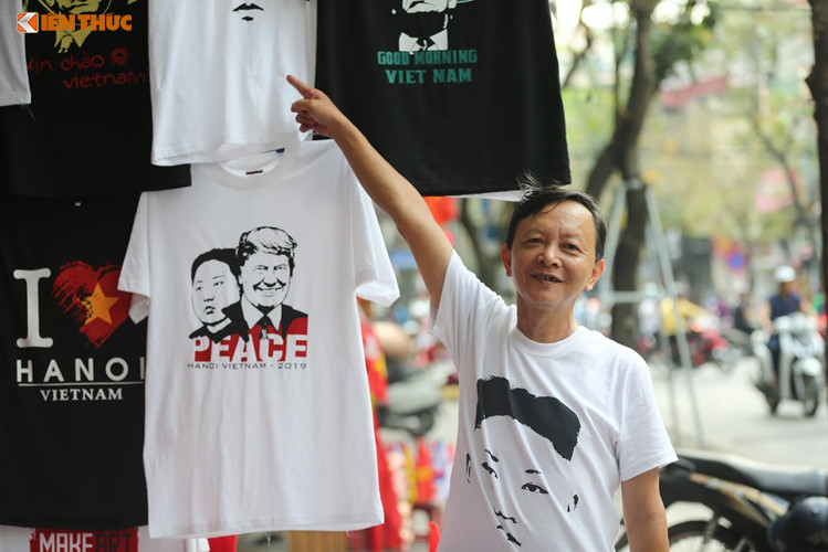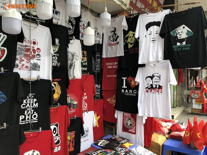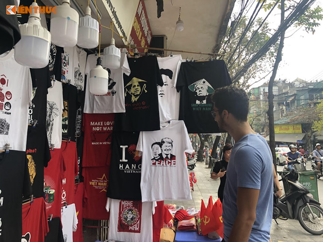 Những chiếc áo in hình Trump và Kim đang được bày bán ở khắp mọi phố ở Hà Nội. Để chào đón Hội nghị thượng đỉnh Mỹ - Triều, nhiều người Việt Nam cũng như du khách đến Hà Nội đã kịp sắm cho mình những chiếc áo in hình Tổng thống Donald Trump và Chủ tịch Kim Jong-un.