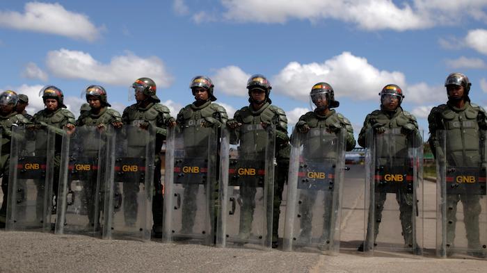 Quân đội Venezuela thuộc kiểm soát của chính quyền Maduro đứng gác tại biên giới Brazil để ngăn chặn viện trợ nước ngoài (Ảnh: Reuters)