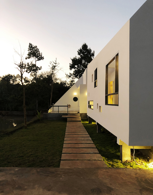 Lối đi với các bậc đá trên thảm cỏ xanh, giống như đường ray tàu, dẫn đến bậc tam cấp để vào nhà. Không gian hướng hồ được cách điệu theo kiểu nhà sàn càng khiến ngôi nhà nổi bật.